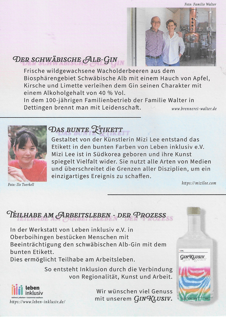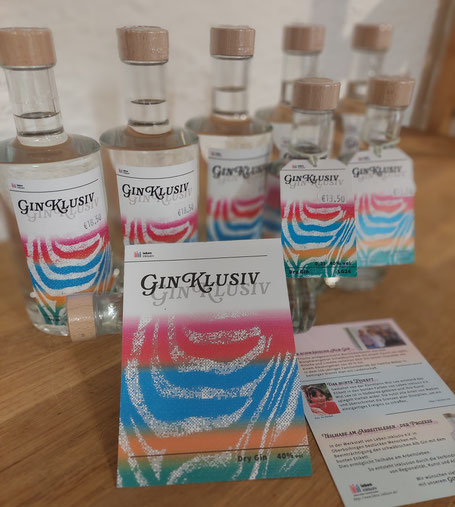 Jetzt bei uns erhältlich! Der 'Ginklusiv'. Gebrannt von der Familie Walter in Dettingen. Das Design von der Künstlerin Mizi Lee. Das Etikett wird in unserer Werkstatt in Oberboihingen von Menschen mit Handicap bestückt. Inklusion durch die Verbindung von Regionalität, Kunst und Arbeit.