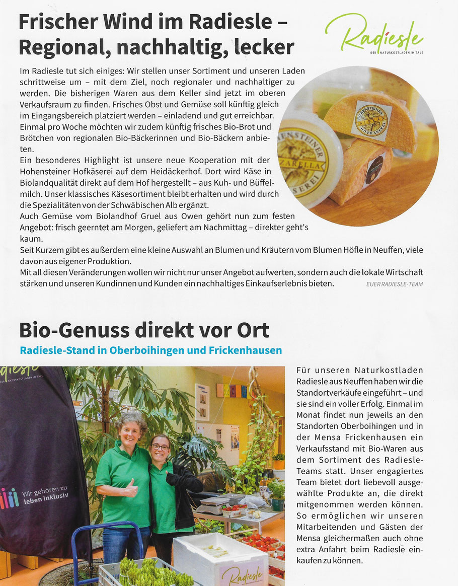 Kaffee beziehen wir unter anderem von der Rösterei Laufenmühle. Diese gehört zur Christopherus Lebens- und Arbeitsgemeinschaft. In der Einrichtung begleiten & fördern Sie ca. 130 Menschen mit einer geistigen Beeinträchtigung. Bereits seit 2010 rösten Sie feine Bio-Kaffees und Espressi (Arabica & Robusta) in der hauseigenen Rösterei. So wird Teilhabe am Arbeitsleben für Menschen mit geistiger Beeinträchtigung (wie bei uns im Radiesle), faire Erzeugerbedingungen und Bio-zertifizierten Anbau miteinander verbunden.